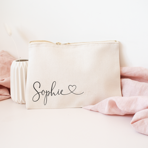 Beautiful Personalised Bridesmaid Makeup Bag with a floral theme and your chosen name. These lovely bags are printed with a high quality DTG machine which prints straight onto the purse allowing a quality finish. This Hen Night Cosmetic Bag is cute pretty and is available in two different sizes. Choose this Bridesmaid Make Up Bag as part of your bridal party gift set. Here at Amy Lucy we have lots of lovely Bridesmaid Favours look through our wedding section to get inspired. We have lots of Bags and Purses suitable for the Bridal Party. We also have lots of Bridal Party Gifts so take and look today. Choose from Rose Gold, Yellow Gold, Metallic Silver or a Black font. Features- Makeup Bag 23 L x 17 H x 2cm D, approx. 100% Brushed Cotton Canvas 407gsm Multi-purpose use Vintage style metal zip