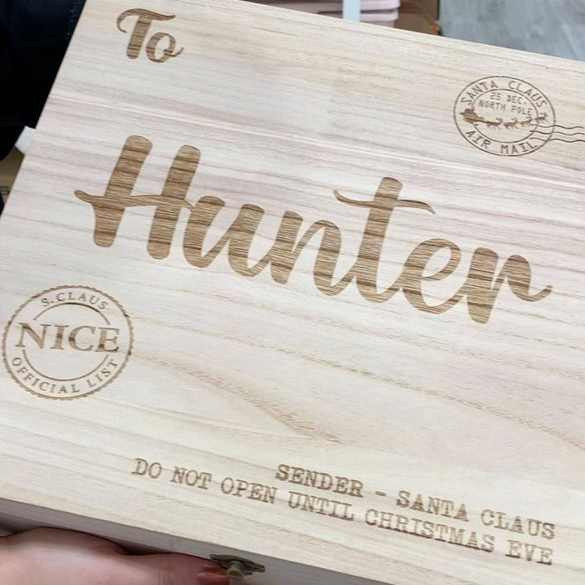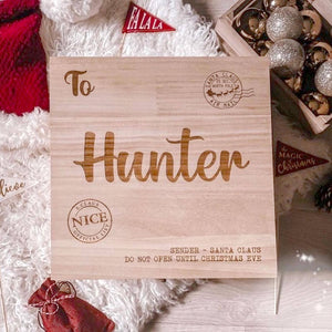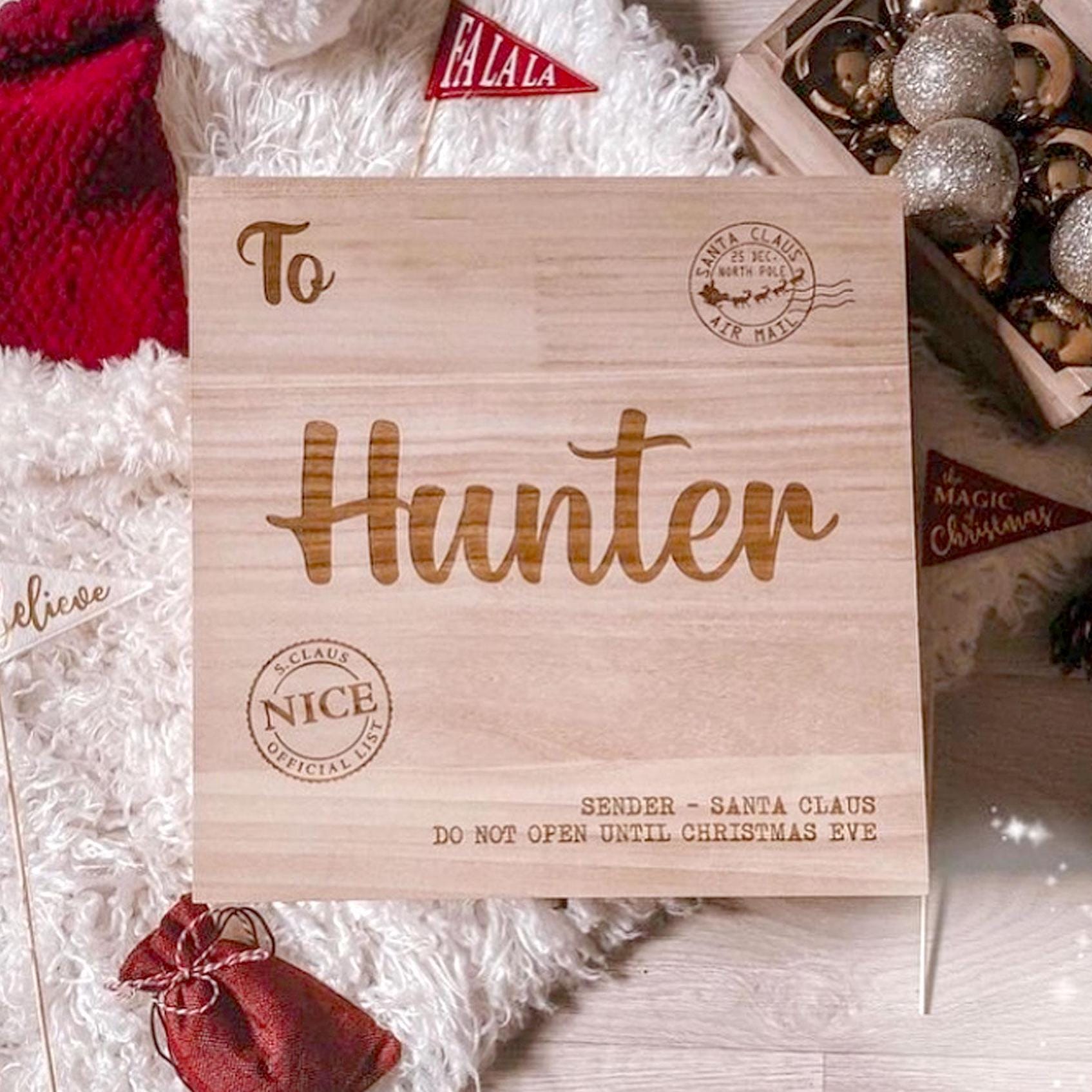 1. This beautifully crafted wooden box, engraved with the words "To Hunter," serves as a personalized Christmas Eve box, perfect for creating cherished holiday memories. Designed to hold letters to Santa and other festive treasures, it combines elegance with functionality, making it an ideal gift for children and families alike. The durable construction ensures that this box can be treasured for years to come, while its unique engraving adds a special touch to your Christmas traditions.