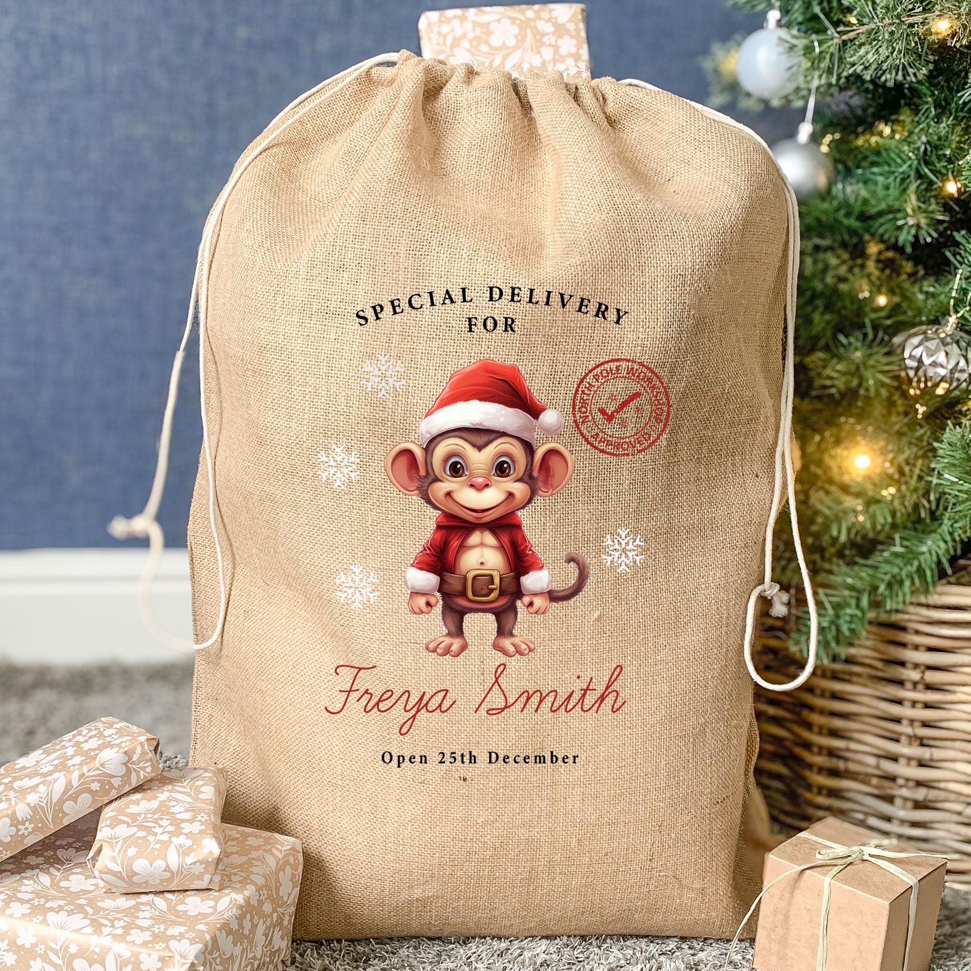 Personalised Christmas Sack, Cute Jute Christmas Sack, Country Xmas Sack, Santa Sack, Animal Santa Sack, Xmas Decor, Monkey Xmas Sack