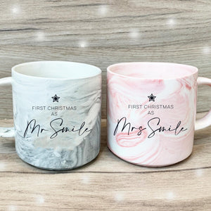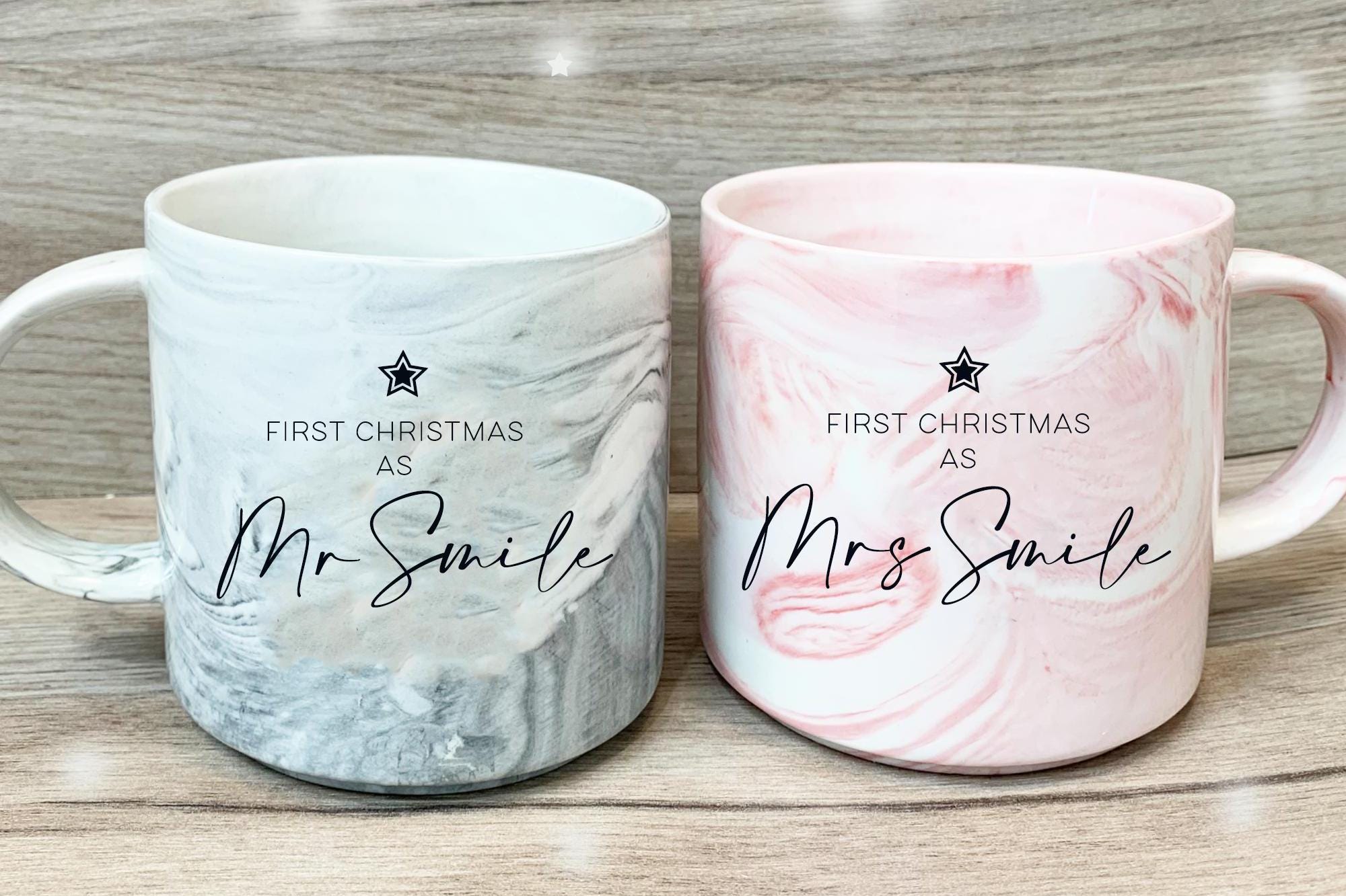 Our Personalised First Christmas Mr Mrs Mug are deluxe marble patterned mugs inside and out for you to keep as special keepsakes from your wedding.