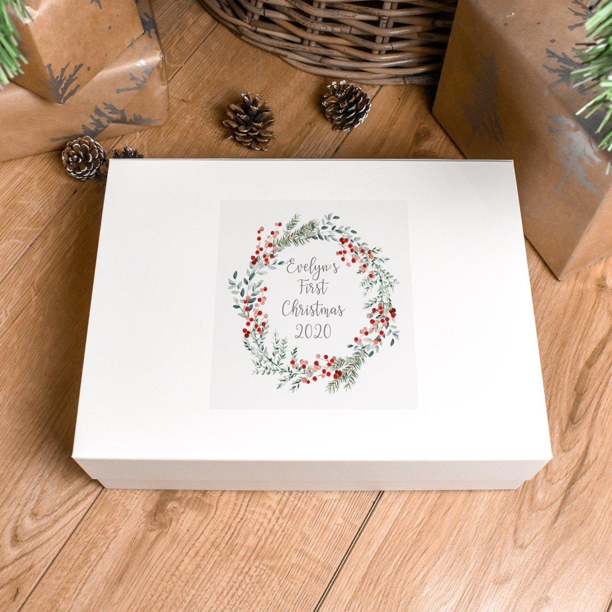 Celebrate baby's first Christmas with our personalized gift set. This gift box includes a soft toy, decoration, and vest for a memorable and unique keepsake. Perfect for remembering this special milestone.