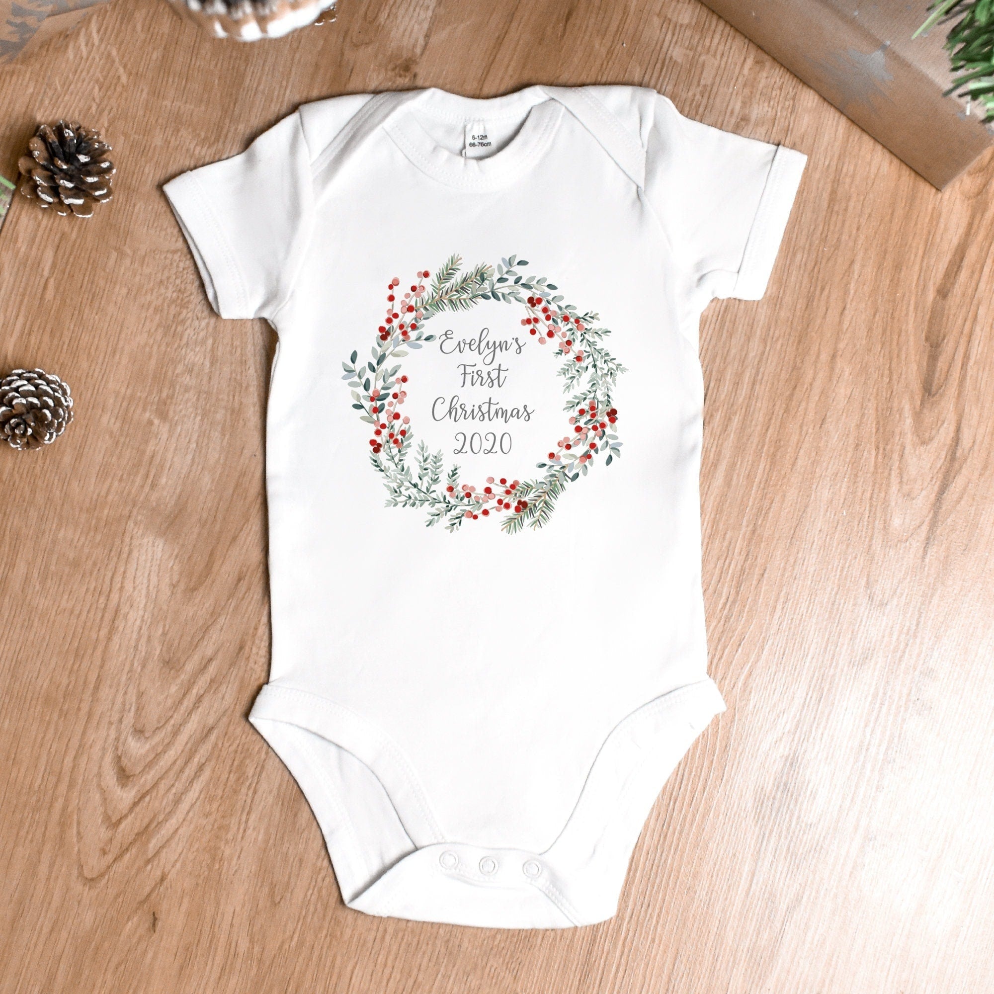Available in a First Christmas or Name Only design, this Baby Xmas Keepsake features a stunning festive holly wreath design that has a timeless and traditional Christmas feel.