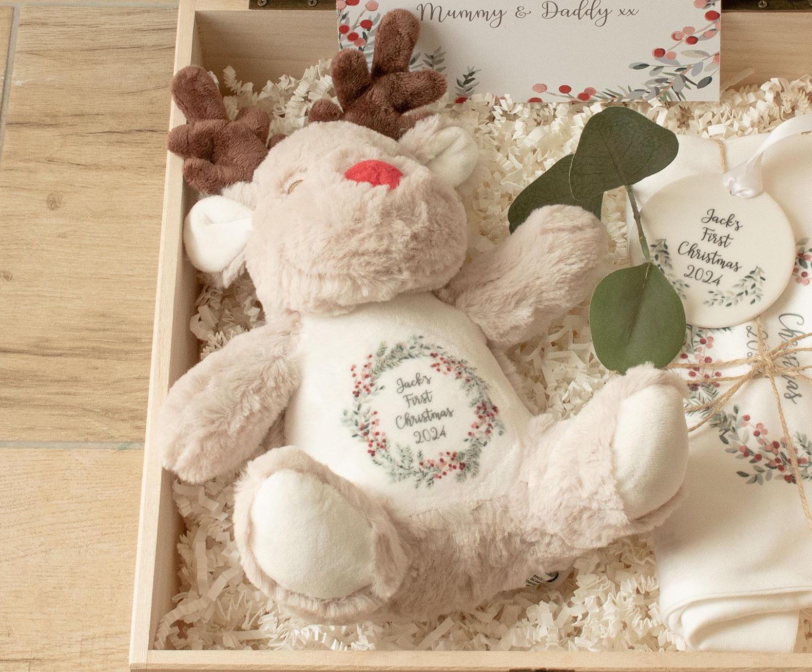Inside this beautiful box includes a personalised Reindeer teddy; a gorgeous personalised baby bodysuit; and a special personalised ceramic bauble.