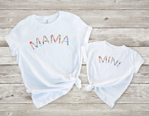 All adult sizes will be printed with 'Mama' and child sizes with 'mini'.