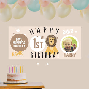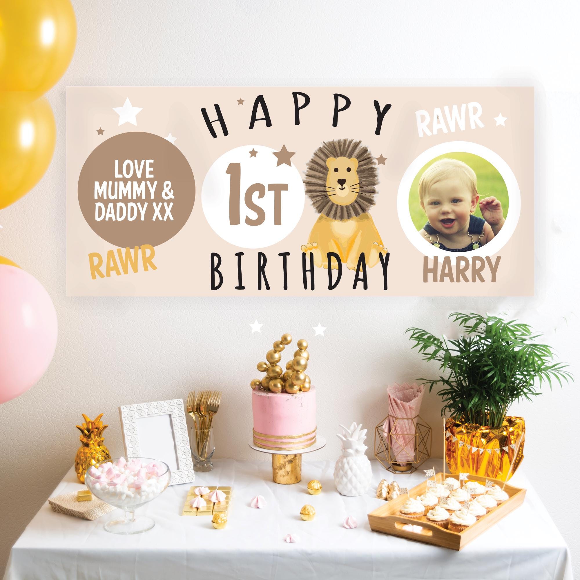 Personalised 1st Birthday Banner, Neutral 1st Birthday Banner, Age Photo Birthday Banner, Lion Jungle Birthday Banner, Child 1st Party Large