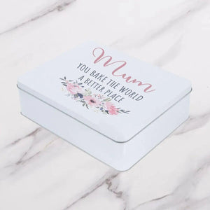 Featuring the slogan 'you bake the world a better place', this mum baking gift is perfect for Mums and Nans who love baking delicious home-made goodies. Customise this personalised baking tin with the name of your loved one for an extra-special and personal touch. Suitable as a cake tin, cookie tin or scone tin, why not fill this personalised Mother's Day gift with some yummy treats for her to enjoy on her special day.
