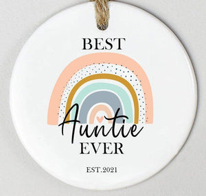 A lovely Personalised Best Auntie Sign printed in a beautiful Amy Lucy pattern, featuring a special rainbow. This Best Aunty Gift is a beautiful gift that she will love and be able to use for a long time to help to remind her of her new niece or nephew. A ceramic Aunty Ornament made with a sublimation process so that the pattern sinks deep into the mug making it dishwasher safe and long lasting. This Best Aunty Gift will help your Auntie feel how much you care, and she will have a constant reminder as she displays her new ornament. A thoughtful Rainbow Gift printed in-house just for you to your specifications. A super Relation Gift ready to give as it has the string included. Features- > Ceramic Material > Printed with a Sublimation Process > Personalised Name >String Included