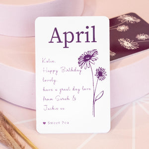 Our Personalised Birth Flower Card features a beautiful month birth flower drawing with your name on the front and a message, on the back is a flower print.