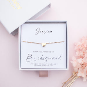 This Personalised Bridesmaid gift is perfect. A gold heart set on a chain with a clasp at the back. The necklace is a standard length so will be suitable for all ages.