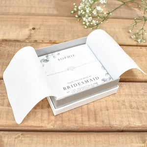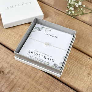 A beautiful Personalised Bridesmaid Gift presented in a pretty high quality gift box. This Bridesmaid Jewellery is a pretty necklace on card in in a presentation box and will help your girls fell truly grateful. Give this Thank You Bridesmaid Gift as your wedding reception or after the wedding to say a great big thank you for all of their support and love. This Personalised Bridesmaid gift is perfect. A silver heart set on a chain with a clasp at the back. The necklace is a standard length so will be suitable for all ages. Use this Thank You Maid of Honour Gift in a hamper or on it's own. You will receive 1 x Silver Heart Necklace on thick White Card (9.5cm x 9.5cm) with your chosen design, message and Name. Card Options- Option 1- Line 1- Name Line 2- Thank you for being my Line 3- Bridesmaid (your choice) Line 4- My 'I Do' wouldn't be the same without you Options 2- Line 1- Name Line 2- Thank you for being my Line 3- Bridesmaid (your choice) Line 4- I'd be such a lucky bride to have you by my side KEY FEATURES • Adjustable Chain - 44cm Length • Necklace arrives on personalised, luxury card in luxury necklace box • Customise at no extra cost • High quality print & original design • Ideal gifts for DIY Bridesmaid Gift Hamper