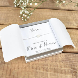 A beautiful Personalised Bridesmaid Gift presented in a pretty high quality gift box. This Bridesmaid Jewellery is a pretty necklace on card in in a presentation box and will help your girls fell truly grateful. Give this Thank You Bridesmaid Gift as your wedding reception or after the wedding to say a great big thank you for all of their support and love. This Personalised Bridesmaid gift is perfect. A silver heart set on a chain with a clasp at the back. The necklace is a standard length so will be suitable for all ages. Use this Thank You Maid of Honour Gift in a hamper or on it's own. You will receive 1 x Silver Heart Necklace on thick White Card (9.5cm x 9.5cm) with your chosen design, message and Name. Card Options- Option 1- Line 1- Name Line 2- Thank you for being my Line 3- Bridesmaid (your choice) Line 4- My 'I Do' wouldn't be the same without you Options 2- Line 1- Name Line 2- Thank you for being my Line 3- Bridesmaid (your choice) Line 4- I am such a lucky bride to have you by my side KEY FEATURES • Adjustable Chain - 44cm Length • Necklace arrives on personalised, luxury card in luxury necklace box • Customise at no extra cost • High quality print & original design • Ideal gifts for DIY Bridesmaid Gift Hamper