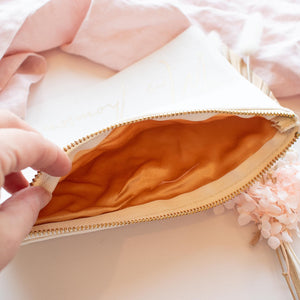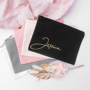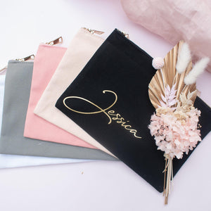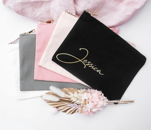 A pretty Personalised Bridesmaid Makeup Bag featuring your chosen name and party member role like bridesmaid, maid, mother of the bride, maid of honour etc.