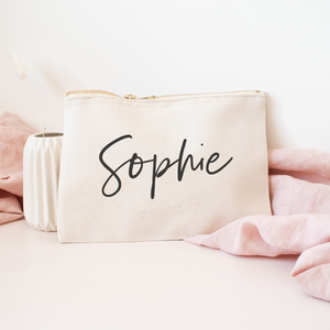 Our lovely Personalised Bridesmaid Makeup Bag is available in two different sizes. Our larger bag will fit in all of your bridesmaid make up and any extras. Our smaller bag will fit in the essentials she may need on the wedding day like her lipstick and eyeliner etc. Our Name Make Up Bag is made from a quality cotton in a heavy gsm. They are durable and beautiful to. This Bridesmaid Favour is not only one she can use for the wedding but also one she can use again and again and cherish as a memento of you her friend. This Maid of Honour Bag is custom printed just for you with your details. Choose these as Hen Night Gifts to create a special hamper or box set. This Hen Party Favour is of a high quality the vinyl is in a metallic effect and in heat pressed for a long lasting finish.