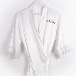 These Bridal Robes come in either a pink or a white with black text. You can have the girls name on the front and the name party role and date on the back of her robe.