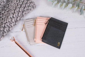 A Personalised Card Holder in a faux leather, available in three colours black pink or a light grey. These are a lovely Monogram Coin Purse printed with a debossing hot foil machine allowing a stylish indent either in a plain colour a gold, rose gold or a silver. Due to the hot foil process there is no peeling or cracking as there is no vinyl, allowing a long lasting quality finish.
