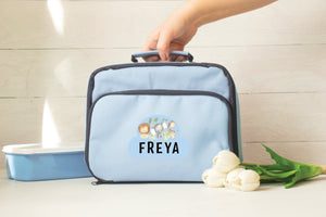 A Personalised Childs Jungle Lunch Bag with lots of cute jungle themed animals this is a cute useful and hardwearing set so if can be used for school, nursery or school clubs for a good length of time.