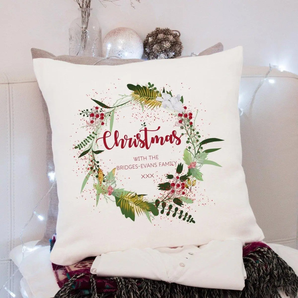 A Personalised Christmas Cushion featuring your family name and a gorgeous wreath. Choose this lovely Family Christmas Cushion to decorate your room this festive season. When it comes to Christmas Decor this year you will have it all sorted. This Christmas Wreath cushion is a lovely quality and comes filled or unfilled to give you more choice. With this Christmas Wreath Cushion you can give it to your mum or friend for Christmas or buy it for your own Home as a Personalised Christmas Gift. Features:- - 40 cm x 40 cm - Woven Cotton/Polyester Blend - Filled Cushion option with Polyester Inner - Washing Instructions: 30° warm wash - Do not tumble dry - Do not dry clean - Warm Iron inside out