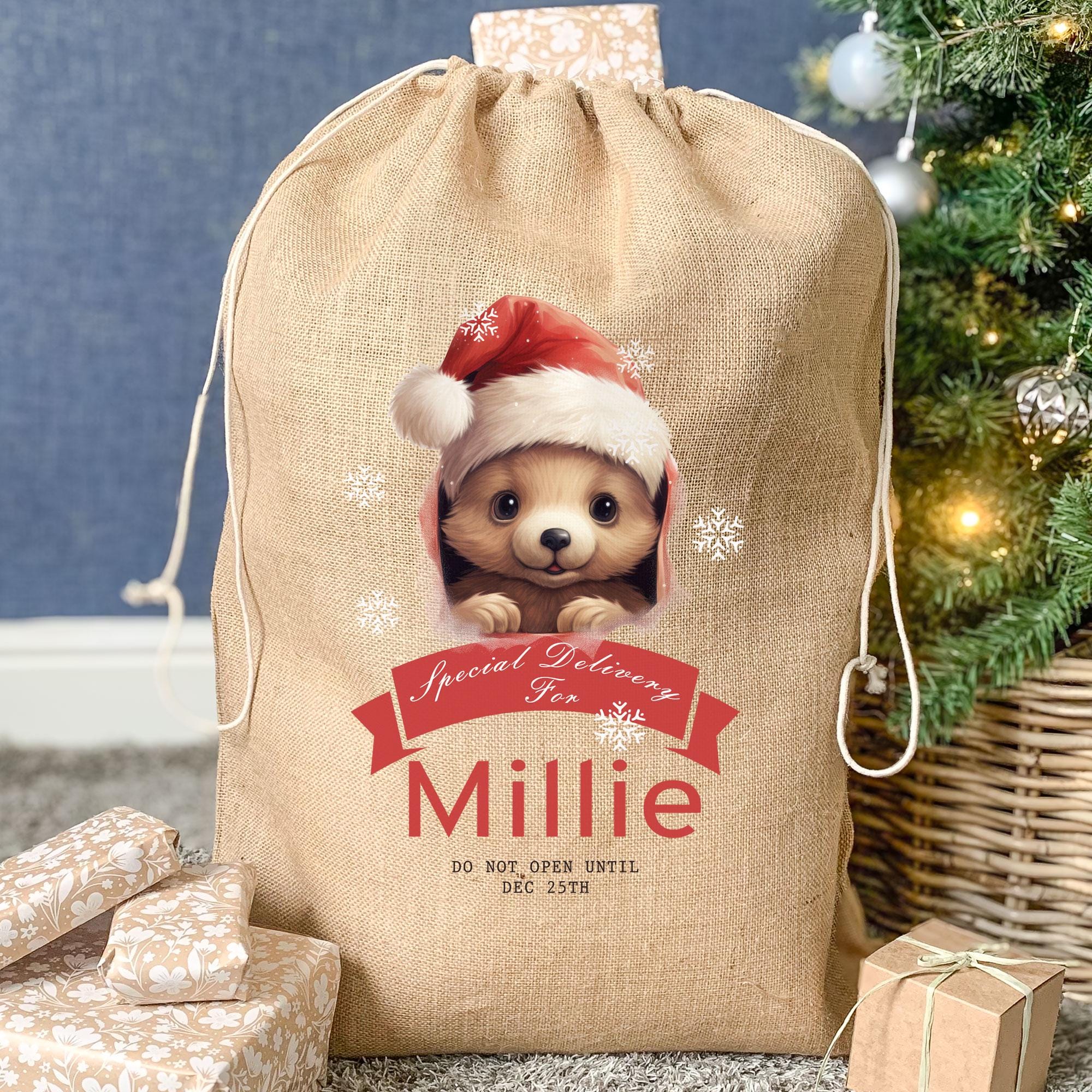 Personalised Christmas Sack, Cute Jute Christmas Sack, Country Xmas Sack, Santa Sack, Bear Santa Sack, Xmas Decor, Bear Xmas Sack