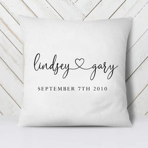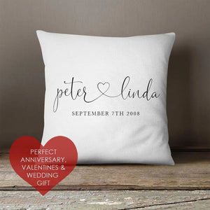 A Personalised Couples Cushion featuring your Custom Name and Date - ideal to show your loved one just how much they mean to you! Choose this Couple Cushion a cotton quality and comes with the option of filled or cushion cover only. This cover comes with a zip so can be easily removed and machine washable -see our care instructions below. This Valentines Gift is something really special and personal for you to display with pride a significant date - maybe the day you first met, your wedding date or first kiss! This is the perfect Valentines Gift for both Men and Women to receive as the style and design is minimal and modern to fit in with all types of home decor! This Custom Names and Date Cushion is a super Gift For Loved One or gift for Valentines Day, Anniversary or Honeymoon . Features:- - 40 cm x 40 cm - Woven Cotton/Polyester Blend - Filled Cushion option with Polyester Inner - Washing Instructions: 30° warm wash - Do not tumble dry - Do not dry clean - Warm Iron inside out