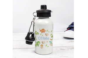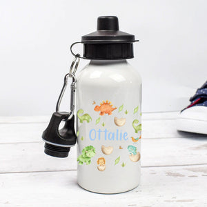A super Personalised Dinosaur Water Bottle made of metal with a comfortable plastic lid.