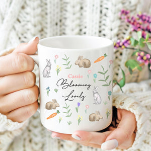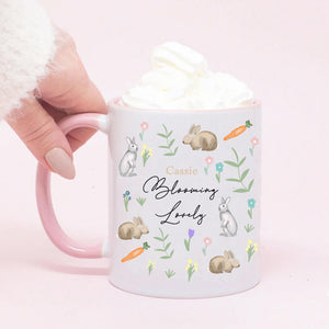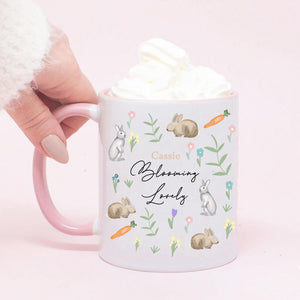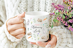 A Custom Name Rabbit Mug with a Spring time theme, this mug features original art from Amy Lucy Designs that has been digitally drawn.