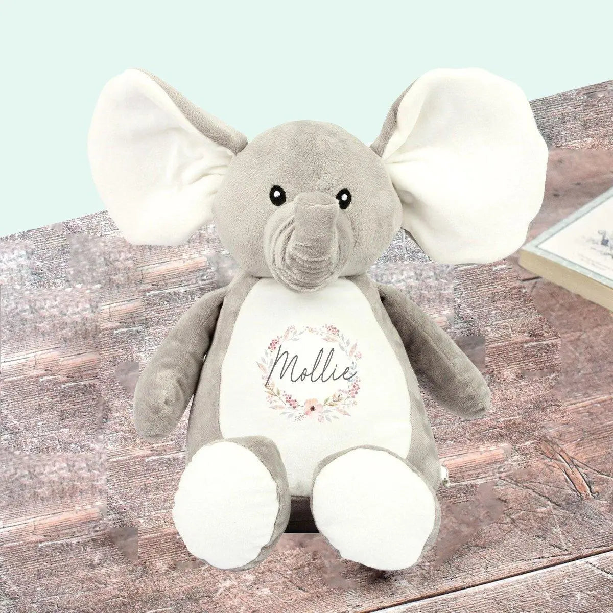 A beautifully soft Personalised Elephant white soft fur and a delightful floral wreath and your chosen name.