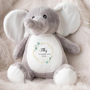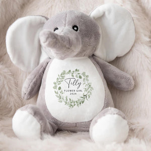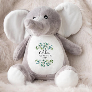 This charming personalised grey and white elephant, adorned with a delicate wreath, serves as a perfect gift for flower girls. Crafted with care, it combines a soft, cuddly design with the option to add a name or special message, making it a memorable keepsake. Ideal for weddings, this elephant not only expresses gratitude but also adds a touch of whimsy to the occasion, ensuring that your flower girl feels cherished and appreciated.