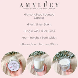 A truly special gift for a loved one or a friend at such a hard time. This Personalised Miscarriage Gift will bring a feeling of love and care. A beautiful Baby Loss Memorial Candle that she/he can burn to help her/him get through the time and remember their little one. An Angel Baby Candle Gift which works well either on it's own or with a hamper. A Personalised Bereaved Mum Gift to bring some warmth to her at a hard time. Personalised Sympathy Gift that can be kept on the shelf or in a special memory box. Features:- - Single Wick 30cl glass - Simple design to Suit any Room - Clean Fresh Linen Scent - Wax Content 174 grams - Perfume of 8% - Perfect Scent Throw for Over 30hrs. - Paraffin Wax - Vegan Friendly - With Safety Label Underneath We only include a delivery note in our parcels that includes the item name, a delivery address and the recipients name. This makes it easier to send to a loved one as the buyers details and prices are not included on the delivery note. Dimensions / Diameter 80mm / Height 93mm