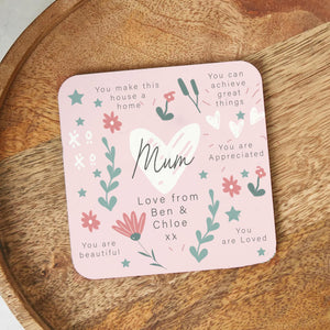 We are so happy to be able to give you this lovely Personalised Mum Affirmation Coaster hand drawn from Amy Lucy totally unique and different.