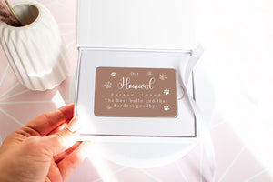 Our Personalised Pet Loss Gift is a lovely metal card printed with a high quality. It has a message one side and your photo on the other side.