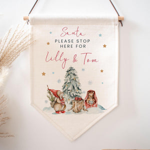 Our Personalised Santa Stop Here Sign is a lovely linen look flag ready to have on your wall near to the fireplace or front door to invite Santa to stop here!