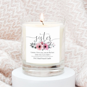 A super Personalised Sister Gift custom made just for her. Show how much you love and care about her by giving this Best Sister Gift. This Candle features a sweet poem about sisters. A Sister Candle Custom Candle with an Amy Lucy floral print. A meaningful Sister Poem Gift Candle with the words- (her name) Someone who shares memories, a keeper of secrets a best friend forever. Personalised Candle suitable a s a Gift For Her. Features:- - Single Wick 30cl glass - Simple design to Suit any Room - Clean Fresh Linen Scent - Wax Content 174 grams - Perfume of 8% - Perfect Scent Throw for Over 30hrs. - Paraffin Wax - Vegan Friendly - With Safety Label Underneath We only include a delivery note in our parcels that includes the item name, a delivery address and the recipients name. This makes it easier to send to a loved one as the buyers details and prices are not included on the delivery note. Dimensions / Diameter 80mm / Height 93mm