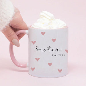 This Personalised Sister Mug has little hearts and a pink handle and inside.