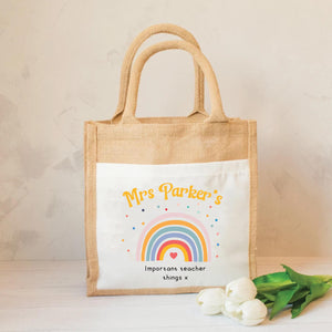 A lovely Personalised Teacher Lunch Bag in a natural colour with a special rainbow on the front to show how grateful we are to the teachers, especially at this time.
