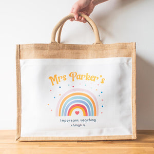 A special Rainbow Teacher Gift in a natural jute material that your teacher can use to carry his/her things.