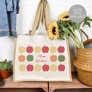 A new Personalised Teacher Tote Bag from Amy Lucy featuring funky apples and your chosen name.