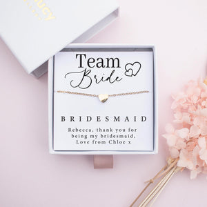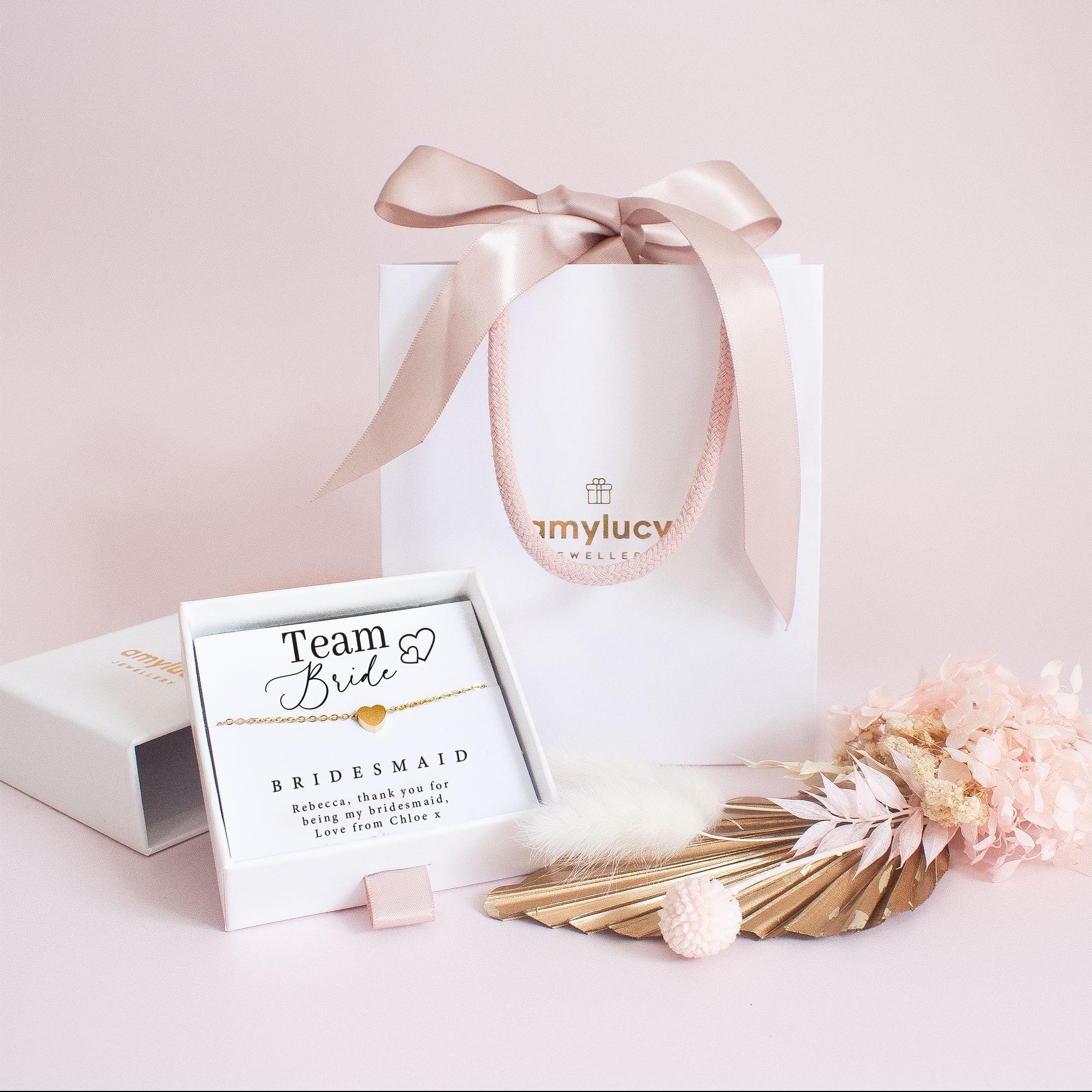 This Team Bride Bridesmaid Gift is a pretty necklace on card in in a presentation box and will help your girls feel truly grateful.