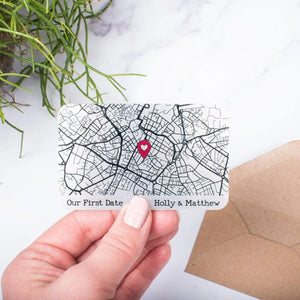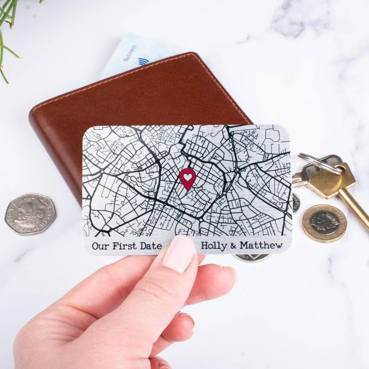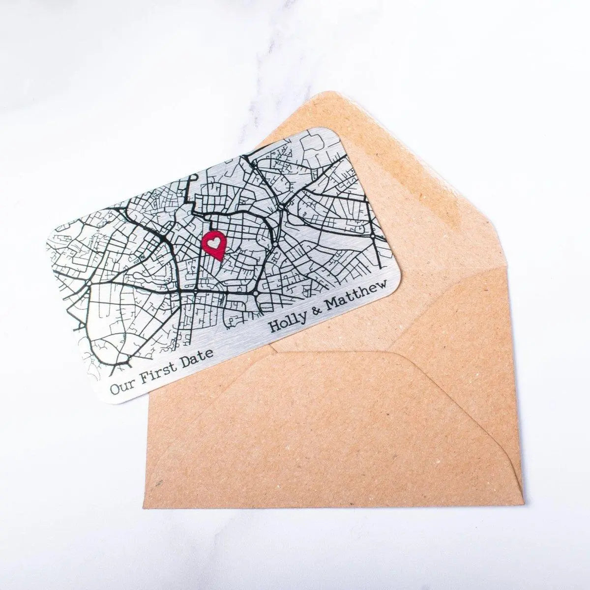 • Personalised special place metal wallet card insert • Add your special event (e.g. Our first date) and your names • Personalised with a map of your special location (please provide a postcode or town) • Size: Approximately 8.5cm x 5.4cm • Arrives ready to gift in a cute, natural brown kraft paper mini envelope.